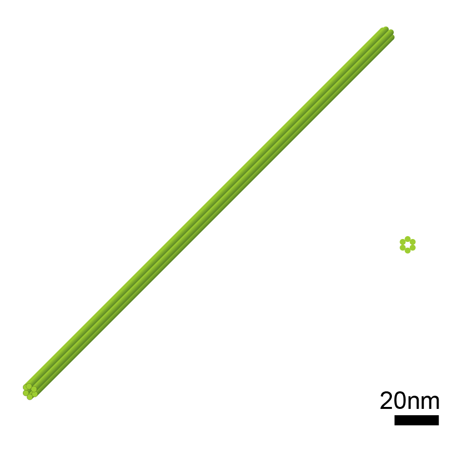 This structure is a rod with total dimensions of 7 nm x 8 nm x 464 nm. It is passivated with poly-T sequences to minimize aggregation. Our recommended Scaffold is 8064bp.
